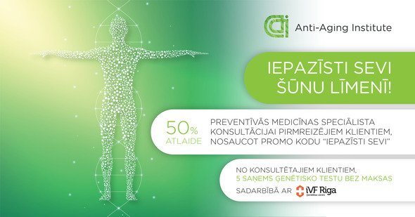 50% atlaidi preventīvās medicīnas speciālista konsultācijai pirmreizējiem klientiem ”Anti-Aging Institute”, nosaucot promo kodu – ”IEPAZĪSTI SEVI”