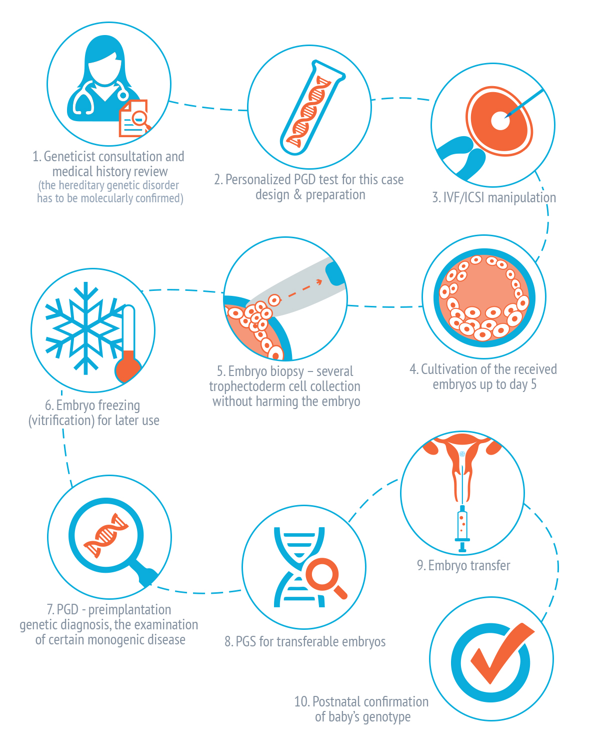 - Viena PGD (PGT-M) cikla ietvaros pārim iespējams saglabāt vairākus embrijus brīvus no patoloģijas nākošajām grūtniecībām.